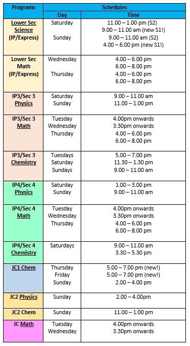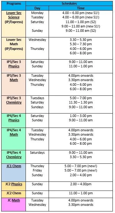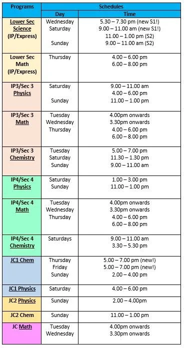 Below is the schedule for our weekly classes in 2026. If you can’t find a timing that is suitable for you, feel free to give us a buzz/Whatsapp and we will be happy to help you schedule a suitable class. As our classes are very small and all our tutors are highly specialised, the slots will be limited. Please bear with us as we ensure your child is placed in the best class for his/her needs!